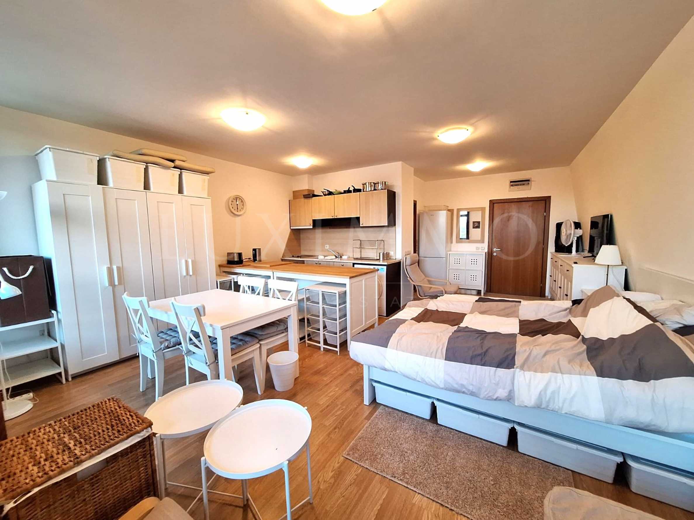 Квартира представляет собой студию и имеет диван-кровать, спальню, обеденный стол, полностью оборудованную кухню, террасу и ванную комнату с ванной и туалетом.