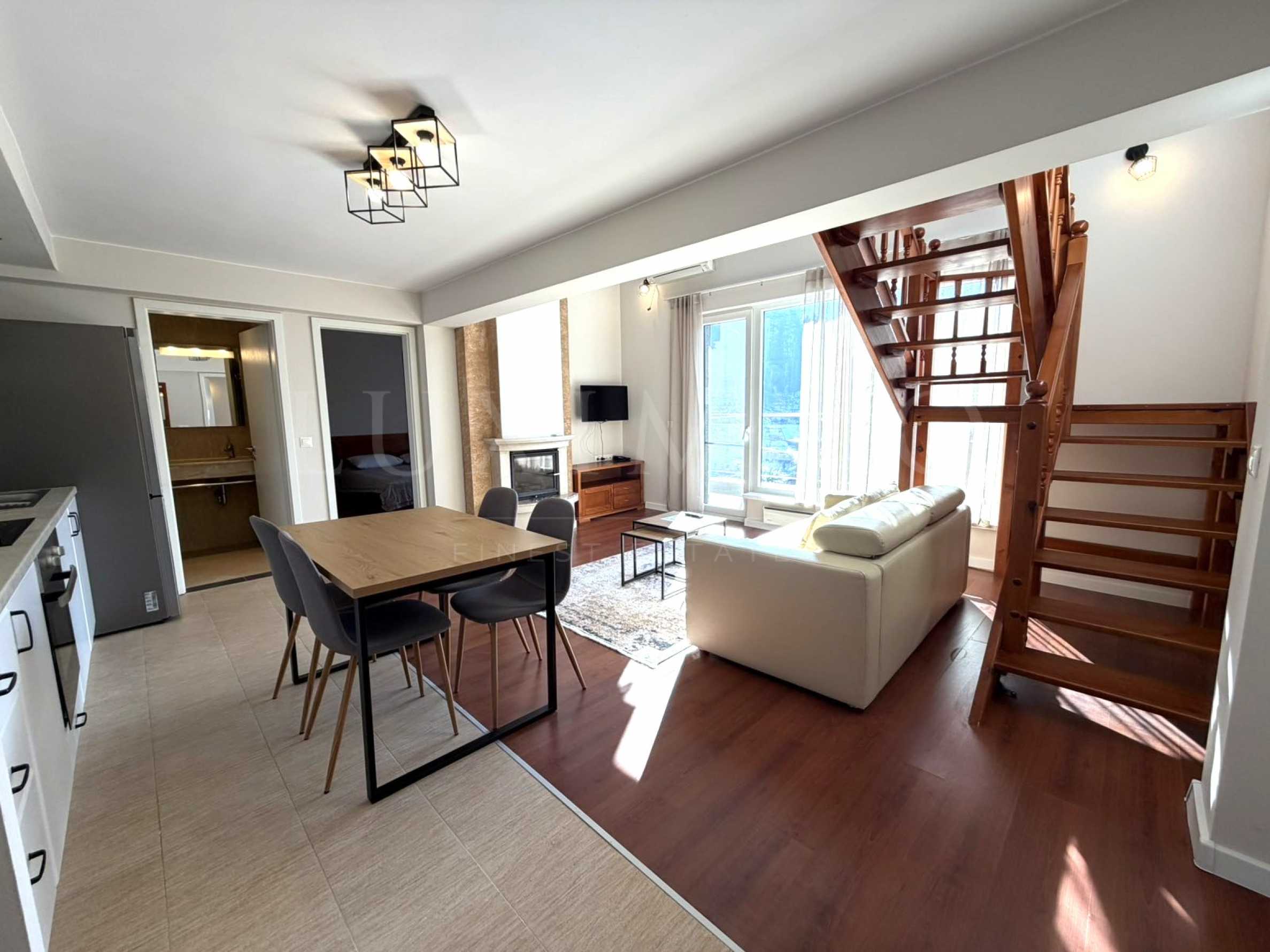 Красивая деревянная лестница соединяет два уровня, что добавляет квартире уюта и элегантности.