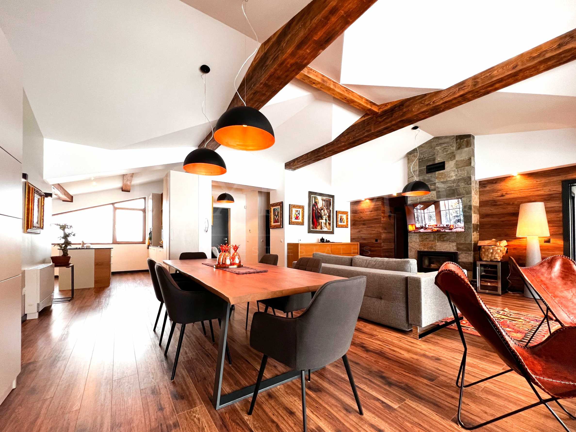Экстерьер и интерьер полностью соответствуют типичному горному стилю – дерево и камень.