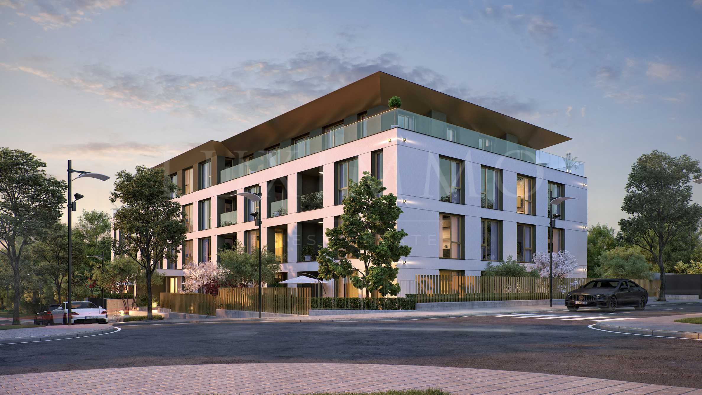 Благоустройство территории является ключевым элементом общего дизайна комплекса. Пространства вокруг здания включают в себя богатую растительность, декоративные деревья, кустарники и газоны, создающие ощущение гармонии и естественной среды. Особое внимание уделено зеленым зонам с интегрированными зонами отдыха, пешеходными дорожками, выложенными декоративным мощением и наружной светодиодной подсветкой, которая подчеркивает архитектурные детали в ночное время.