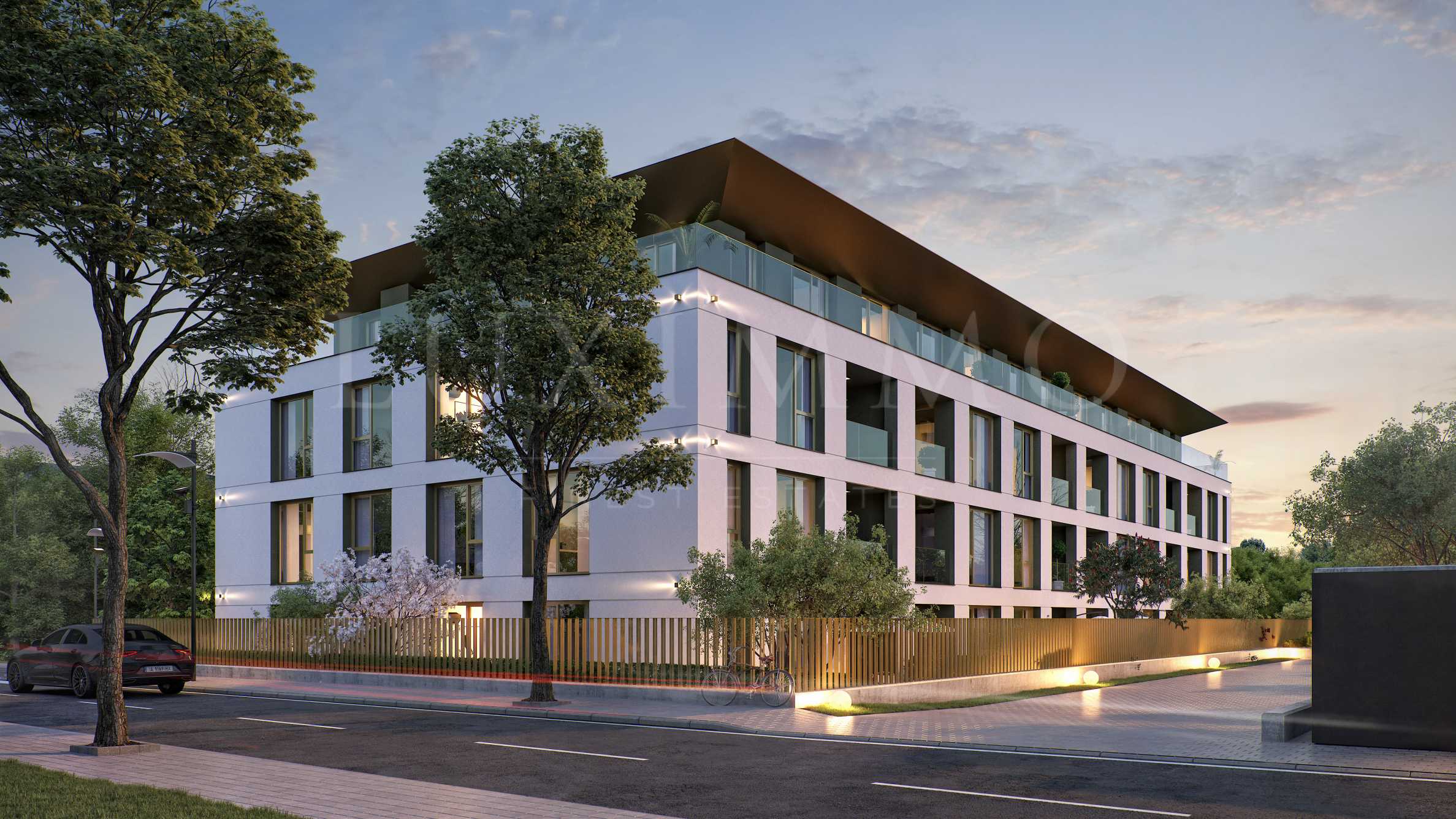 Благоустройство территории является ключевым элементом общего дизайна комплекса. Пространства вокруг здания включают в себя богатую растительность, декоративные деревья, кустарники и газоны, создающие ощущение гармонии и естественной среды. Особое внимание уделено зеленым зонам с интегрированными зонами отдыха, пешеходными дорожками, выложенными декоративным мощением и наружной светодиодной подсветкой, которая подчеркивает архитектурные детали в ночное время.