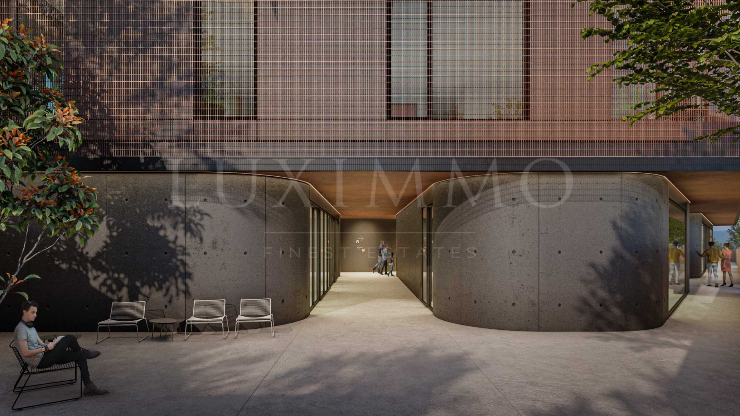Здание впечатляет своей архитектурой и современными решениями. На первом этаже расположены коммерческие помещения и ресторан. Общие зоны выполнены в индустриальном стиле с использованием открытого бетона, кортеновской стали, дизайнерского освещения и авторских постеров, что создает ощущение музея современного искусства. Центральная цилиндрическая лестница освещена естественным светом, проникающим через крышу.