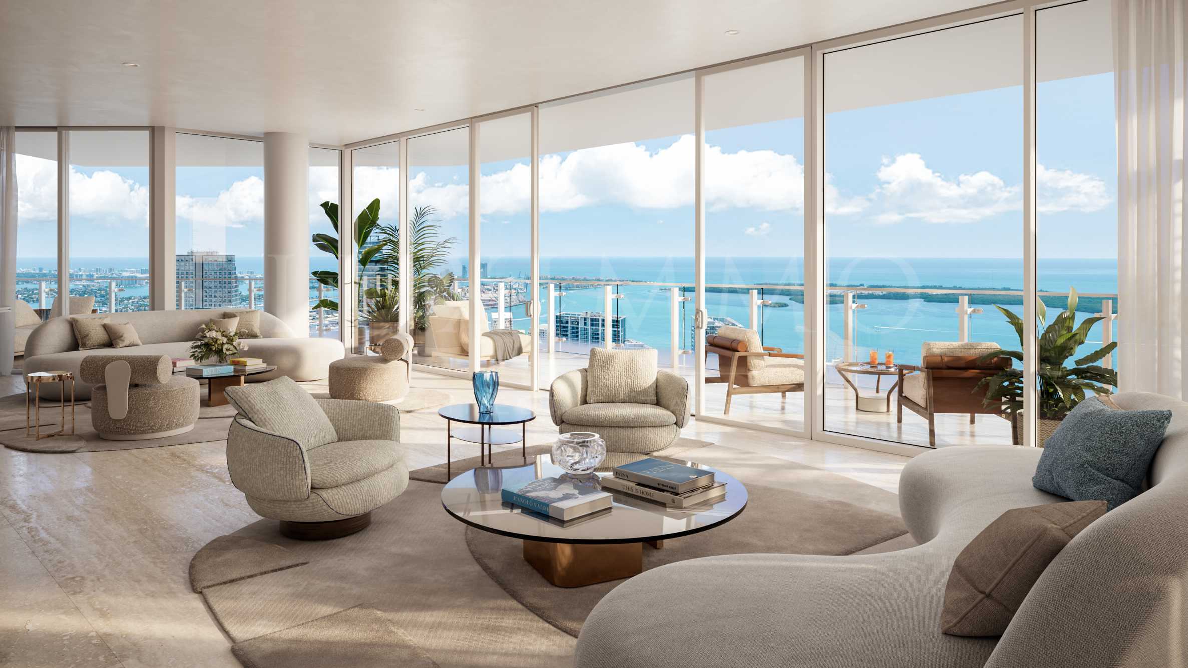 Квартира светлая и вселяет чувство свободы: из окон от пола до потолка открывается вид на реку Майами, а просторная терраса огибает дом, предоставляя возможности для отдыха, размышлений или совместных моментов.